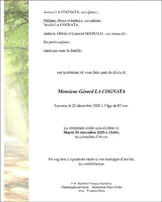 C'est avec beaucoup de tristesse que "Fraternité Afrique" annonce le décès de son Vice-président, Gérard La Cognata, survenu le 22 décembre 2025 à l'âge de 87 ans.